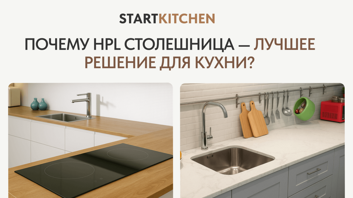 Столешницы на основе HPL-покрытия — популярное решение для кухонь ценового сегмента выше среднего. Материал отлично выдерживает перепады влажности и температуры, характерные для кухни, отличается долговечностью и износостойкостью, а широкая цветовая и текстурная гамма позволяет реализовать разнообразные дизайнерские идеи.